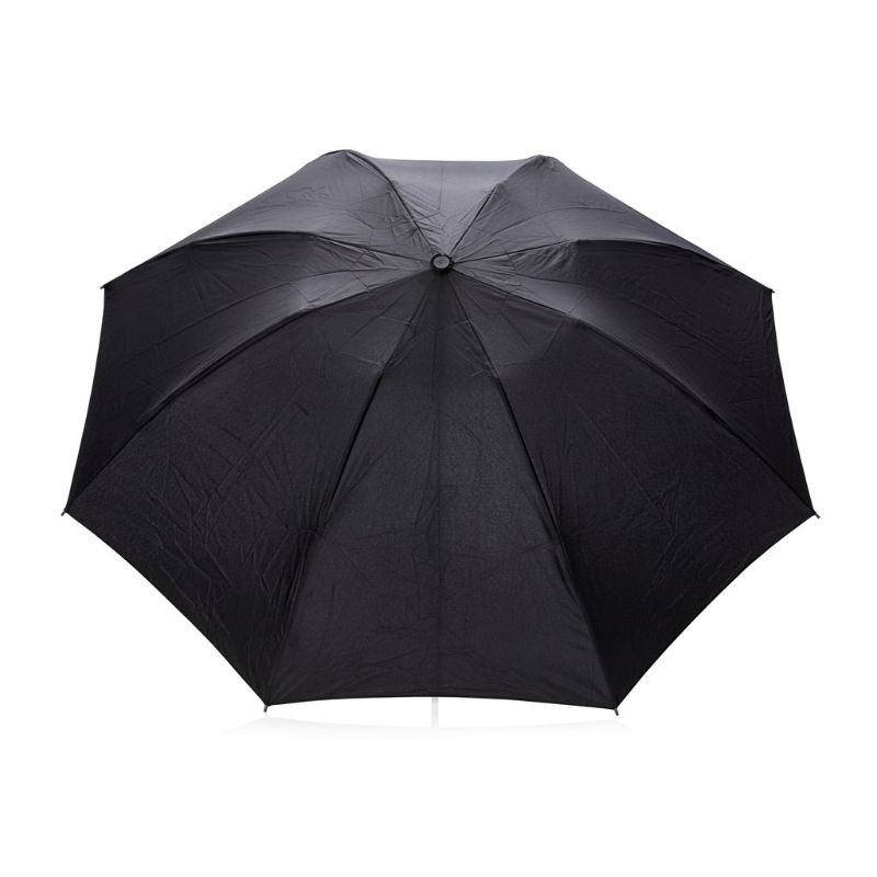 Parapluie réversible 23’’en tissu pongé 190T avec système d’ouverture et fermeture automatique. Manche en acier chromé, baleines en fibre de verre et poignée en ABS noir avec bouton.